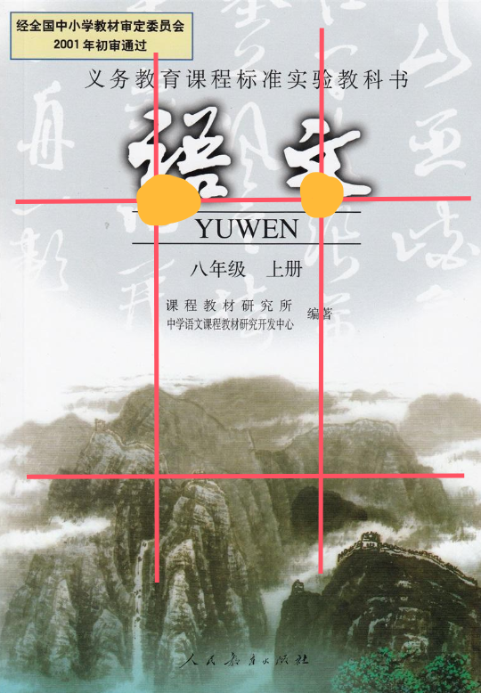 将画面横向、纵向各平均分为三份,形成九宫格。将主体放置在四条分割线的交叉点,或沿着分割线分布,可使画面更平衡且富有张力。 例如:语文课本封面的语文二字就在上面的两个交叉点